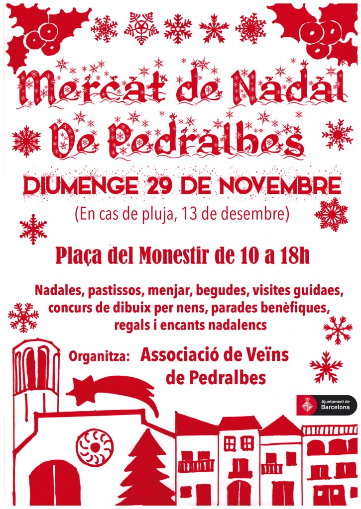 Hi trobareu: parades benèfiques, regals, encants nadalencs, pastissos, menjar, begudes, concurs de pintura per nens, visites guiades al Museu Monestir de Pedralbes, escoltar nadales… en un lloc encantador del nostre barri.
